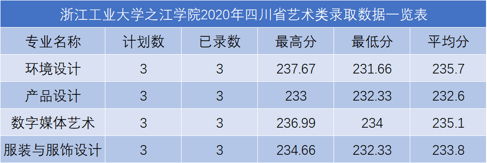 近日,我院2020年四川省艺术类招生计划一次性圆满完成,计划招生12个,实际录取12个。其中,环境设计专业录取最高分237.67分,最低分231.66分;产品设计专业录取最高分233分,最低分232.33分;数字媒体艺术专业录取最高分236.99分,最低分234.00分;服装与服饰设计专业录取最高分234.66分,最低分232.33分 。