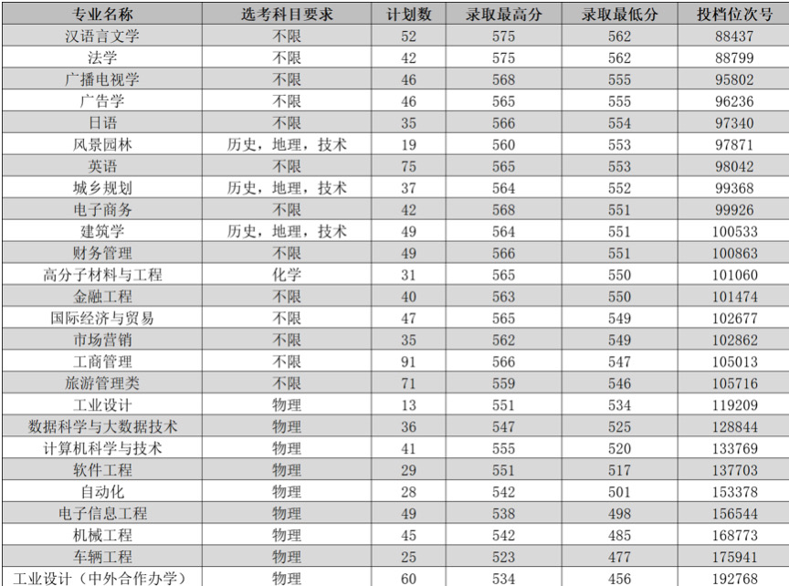 今年我院在浙实际录取新生2230个,其中浙江省普通类实际录取1179个(含“三位一体”综合评价46个)。计算机科学与技术、软件工程、电子信息工程、自动化、机械工程、车辆工程、工业设计、工业设计(中外合作办学)、数据科学与大数据技术等9个选考科目为必选物理的招生专业,录取最高分555分(计算机科学与技术)、最低分456分(工业设计(中外合作办学)),75个必选物理专业二段剩余计划在三段一次性完成;其他普通专业(类)录取最高分575分(汉语言文学、法学)、最低分546分(旅游管理类),投档最低分超出二段线 51分,位次号同比2019年提升5600余名,投档最低分位次号位列省内同类院校第六。学院高度重视“三位一体”综合素质评价工作,招生工作领导小组多次召开专题会议研究相关工作,周密部署疫情防控背景下的“三位一体”综合评价招生工作,确保综合素质测试环节安全、平稳、有序。今年共有3353个考生进行网上注册报名,报名考生数同比往年大幅度提升,录取综合成绩最高分77.35分,最低分69.88分;录取高考成绩最高分560分、最低分508分,录取高考成绩最低分高出二段线13分。浙江省艺术类实际录取142人,录取综合分最高分550分、最低分536分,投档最低分超出艺术类第二批第一段25分。此外,高职单考单招和专升本生源质量持续保持稳中有升。