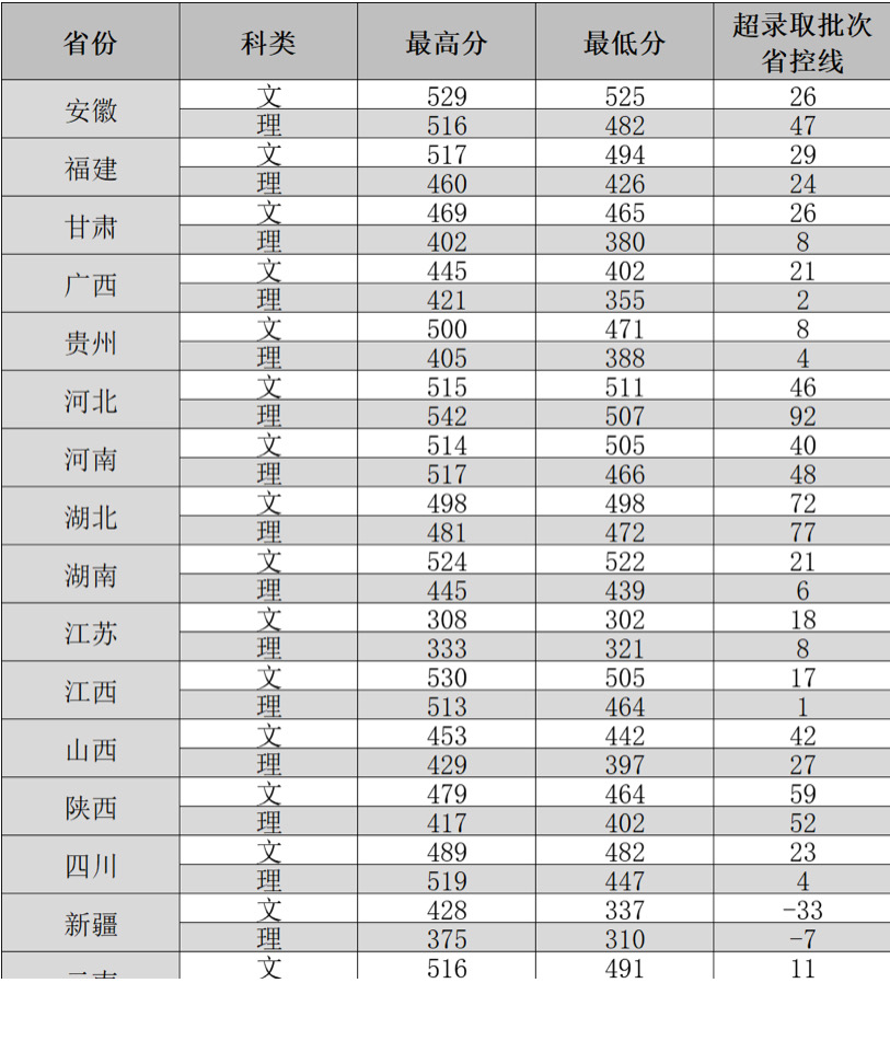 我院今年外省计划735个,同比去年增加20个,实际录取735个,录取率100%。在17个外省招生省份中,除新疆维吾尔自治区定向文理科8个计划和云南理科1个计划降分录取外,其他省份生源均在我院录取批次范围。其中,安徽理科、河北文科、河南文理科、陕西文科超当批次省控线40分以上(含),陕西文理科、重庆文科超当批次省控线50分以上,湖北文理科超当批次省控线70分以上,河北理科超当批次省控线92分。