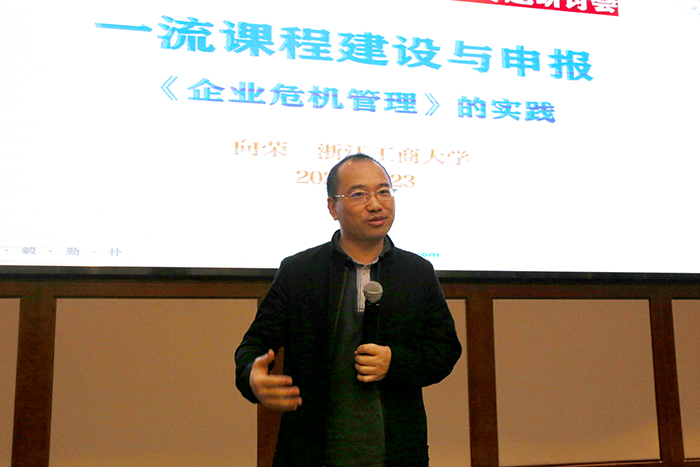 随后,浙江工业大学教务处处长计伟荣教授、浙江工业大学理学院党委书记施建青教授和浙江工商大学工商管理学院副教授向荣分别作了主题报告。计伟荣教授作题为“四新背景下地方高校一流专业建设的思考”的主题报告,从一流专业的建设逻辑、建设内涵和建设路径等三个方面在宏观层面解读了一流专业建设的要义。施建青教授作题为“一流课程内涵、课程思政融合与课堂教学革命”的主题报告,详细阐述了一流课程的内涵,课程思政如何全方位融入一流课程建设和推动课堂教学革命。向荣副教授作题为“一流课程与一流专业的建设与申报”的主题报告,从中观和微观层面,用充实的实践案例,介绍了一流课程与一流专业如何建设,以及如何做好一流课程和一流专业的申报工作。