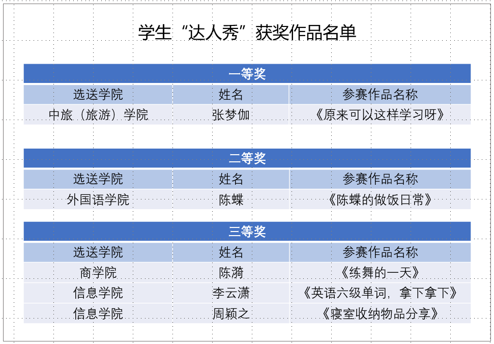 本届达人秀内容涵盖生活技巧类、文体特长类、学习技能类三个不同类别。达人秀的组织工作得到了学院的高度重视和相关部门的大力配合。各二级学院积极挖掘学生达人,活动在全院师生中获得了广泛关注。经过省级复赛、决赛两轮评审,我院选送的9件作品,有5件获奖。其中,作品《原来可以这样学习呀》获得“一等奖”,作品《陈蝶的做饭日常》获得二等奖,作品《练舞的一天》、《英语六级单词,拿下拿下》、《寝室收纳物品分享》获得三等奖。充分展示了我院积极、健康、向上的校园文化氛围和学生全面发展的达人风采。