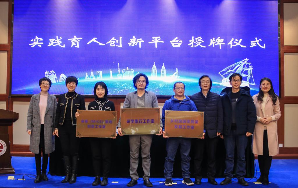 仪式上,潘海涵、陈根宝、程宣梅分别为乡村旅游高质量发展工作室、研学旅行工作室、会展(MICE)策划创意工作室三个实践育人创新平台进行授牌。