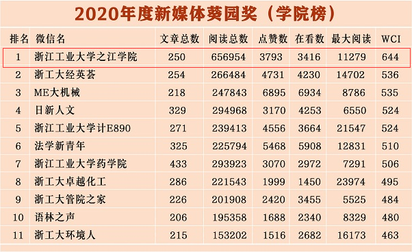 近日,学校召开2021年宣传思想工作会议,会上举行了2020年度校园“葵园基金”新媒体建设表彰仪式。根据第三方平台清博数据官方微信传播力指数(WCI)测算,学校党委宣传部发布了《2020年浙江工业大学微信传播力年榜(学院榜)》,之江学院官方微信公众号稳居学院榜第一,荣获学校“新媒体葵园奖”。这是我院官微自2016年上线以来,连续5年名列学院榜第一并荣获学校“新媒体葵园奖”。
