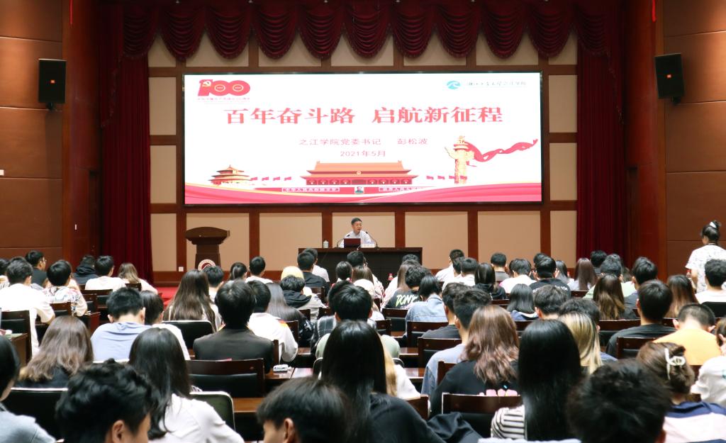 彭松波以中国共产党历史上的三次伟大飞跃为主线介绍了我党的一百年奋斗历程,阐述了中华民族从站起来富起来到强起来的历史转变。中国革命、中国共产党从南湖红船启航,是我们党的根脉,同时浙江也是习近平新时代中国特色社会主义思想的重要萌发地,见证了从“八八战略”到“重要窗口”的历史性飞跃,开辟了中国特色社会主义省域探索的新境界。彭松波还向大家讲述了习近平总书记在清华大学建校110周年校庆日时对青年学子的殷切希望和习近平总书记给北京大学援鄂医疗队全体“90后”党员回信中的谆谆教导。