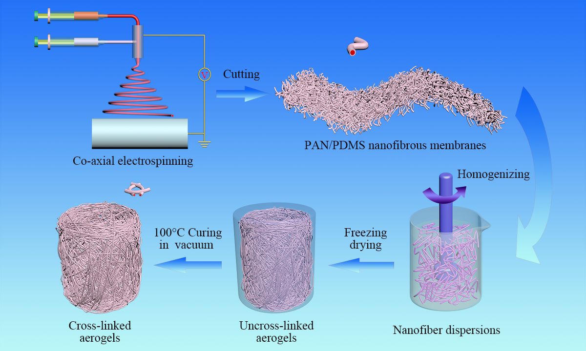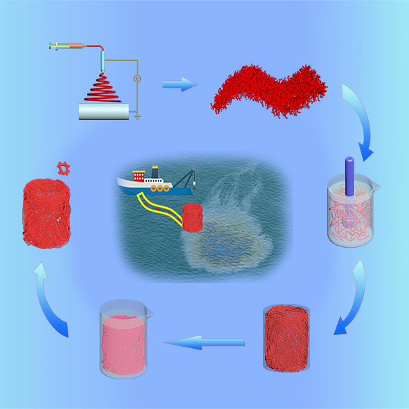 该研究主要是将静电纺丝技术与冷冻干燥技术相结合制备纳米纤维气凝胶,通过一步法和两步法分别在纳米纤维表面修饰PDMS作为功能化改性。研究发现制备的纳米纤维气凝胶材料具有优异的力学及化学稳定性、疏水性及对油和有机溶剂优异的吸附能力,并能够在恶劣环境下实现高效油水分离,在石油泄漏和化学试剂泄漏处理中具有较大的应用潜力。