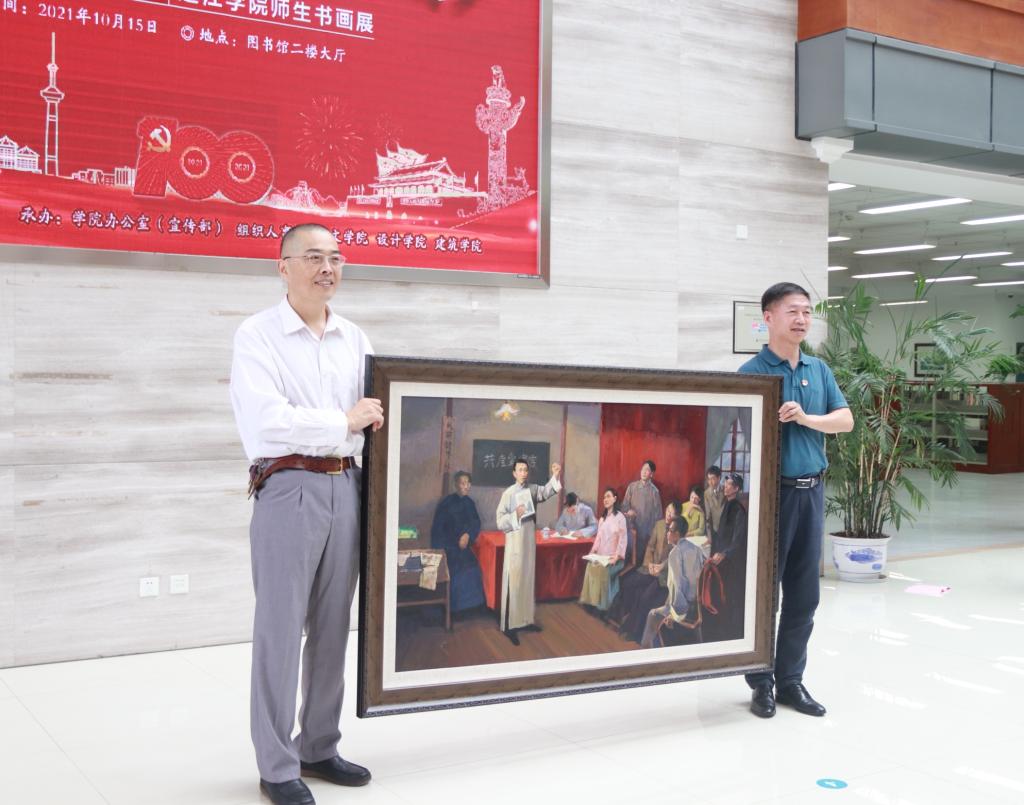 仪式上,设计学院邹迎双老师代表书画参展者发言,畅谈创作感想。学院领导为参展师生代表颁发书画作品参展证书,建筑学院卢家华老师向学院捐赠了自己创作的油画作品。