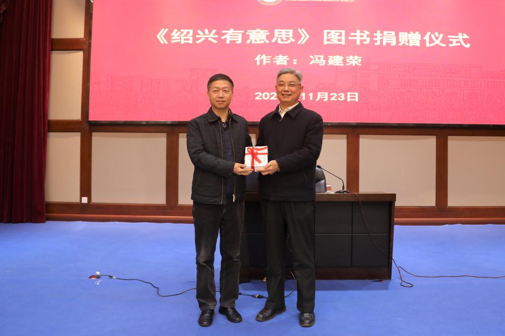 报告会上举行了《绍兴有意思》图书捐赠仪式,学院党委书记彭松波代表学院接受捐赠,并向冯建荣颁发收藏证书。