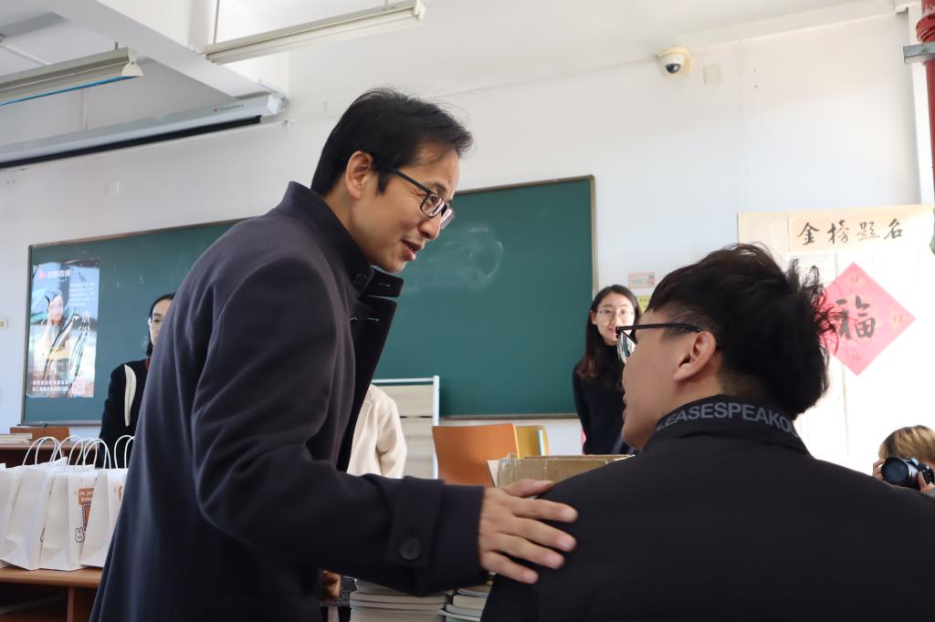 陈根宝与考研学生亲切交流,他充分肯定了同学们坚持学习、克服困难、勇攀高峰、实现新理想的精神。他建议在冲刺阶段及时调整备考战略,扬长避短,重点发挥自身优势学科,稳住短板科目,要注意劳逸结合,以最饱满的状态参加考试。同时要注意身体,保持积极放松的心态,沉着应考,也祝福同学们都能一战成硕。创新创业学院为学生分发了文具、水果以及祝福卡片。