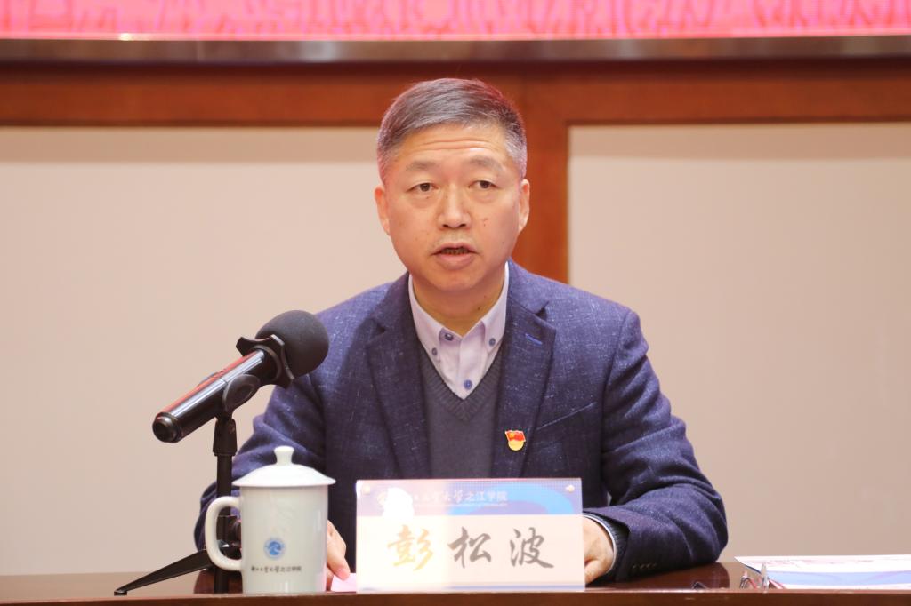 彭松波指出,学院党史学习教育取得了一些成绩,但对标习近平总书记重要讲话精神,对照师生所盼,还存在一些不足。他就进一步固化党史学习教育成果,构建党史学习教育融入日常,抓在经常的常态长效机制提出四点要求。一是要把党的政治建设摆在首位,把对党忠诚贯穿始终。要提升政治判断力、政治领悟力、政治执行力,用行动诠释忠诚和担当,以更强的责任感和紧迫感推进党史学习教育常态化机制化建设。二是要强化党的创新理论武装,把坚定信仰信念贯穿始终。要深化学习的方式和方法,打造红色文化的教育品牌,教育引导广大师生以奋进姿态谋求新发展。三是要牢记党的初心使命,把忠实履行职责贯穿始终。筑牢“以师生为中心”的发展思想,构建有品质、有温度、有特色的新时代教育工作新格局。四是要发扬党的奋斗精神,把服务区域发展贯穿始终。要把学习成果转化为推动学院中心工作结合起来,主动服务地方经济社会发展,打造校地发展共同体,不断彰显区域性和应用型地方高校的责任担当。