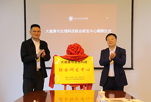 会上,中国老龄协会老年人才信息中心项目办负责人与姜少飞共同为大健康与生物科技联合研发中心揭牌。中国老龄协会老年人才信息中心、国龄人才发展(北京)有限公司代表分别与浙江工业大学柯桥创新研究院负责人签署了合作协议。