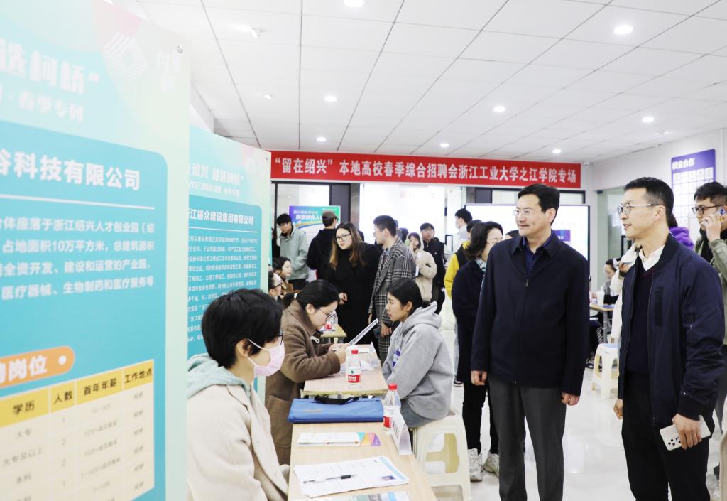 3月17日下午,2023年“留在绍兴”本地高校春季综合招聘会浙江工业大学之江学院专场招聘会在我院大学生创业园顺利举办。绍兴市人力资源和社会保障局党组成员、绍兴市就业促进和人力资源服务中心主任陈海淮,柯桥区人力资源和社会保障局党组副书记、副局长沈国华,学院院长姜少飞、党委书记何作井莅临招聘会现场指导工作并与用人单位亲切交谈,绍兴市人社局、柯桥区人社局、学院办公室、创新创业学院相关职能部门负责人、二级学院相关负责人陪同。