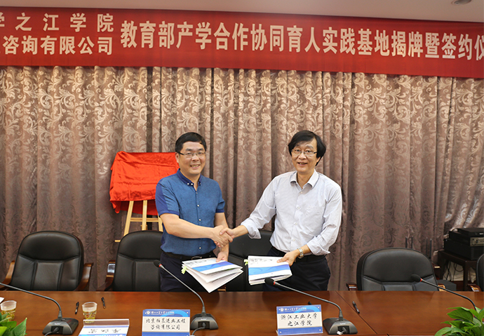 4月24日,我院与北京柏慕进业工程咨询有限公司(以下简称“北京柏慕”)的教育部产学合作协同育人项目合作签约仪式在之江学院行健楼111举行。 学院副院长潘海涵、北京柏慕副总裁廖江宏、浙江地区区域经理王威及教务部、创新创业学院、建筑学院等有关负责人和师生代表参加了揭牌签约仪式。