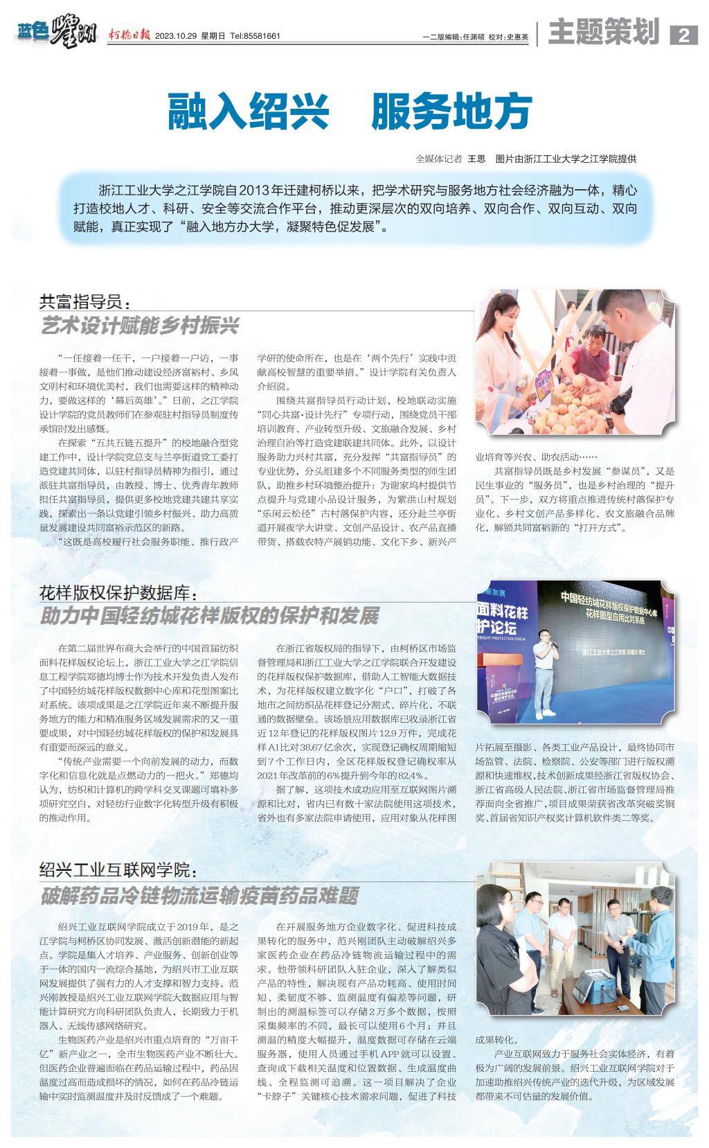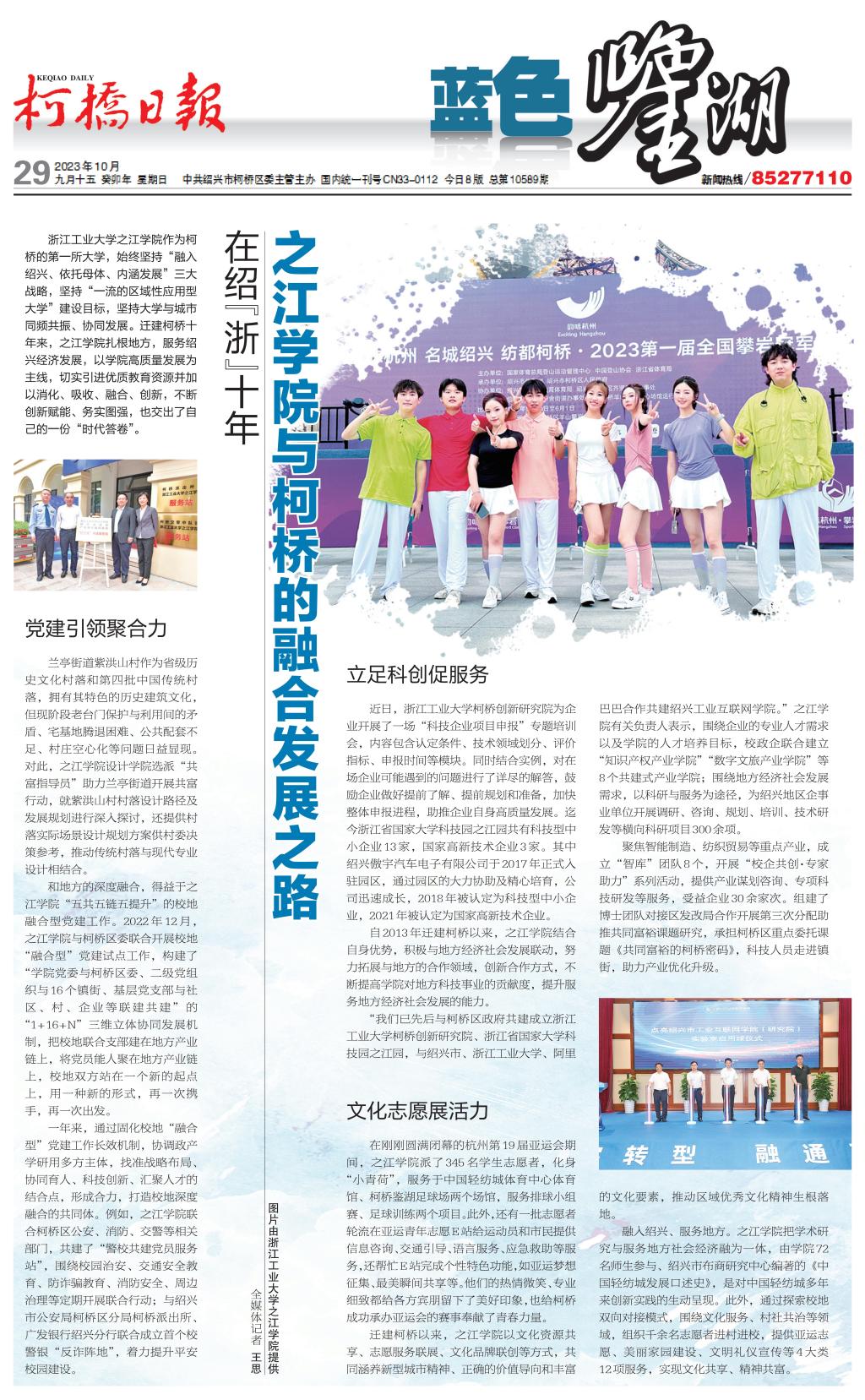 10月29日,《柯桥日报》一版、二版以《在绍“浙”十年 之江学院与柯桥的融合发展之路》《融入绍兴 服务地方》为题,从党建引领聚合力、立足科创促服务、文化志愿展活力、服务地方显成效等方面详细报道了我院迁建柯桥十年来取得的办学成效。报道指出,之江学院作为柯桥的第一所大学,始终坚持“融入绍兴、依托母体、内涵发展”三大战略,坚持“一流的区域性应用型大学”建设目标,坚持大学与城市同频共振、协同发展。迁建柯桥十年来,之江学院扎根地方,服务绍兴经济发展,以学院高质量发展为主线,切实引进优质教育资源并加以消化、吸收、融合、创新,不断创新赋能、务实图强,真正实现了“融入地方办大学,凝聚特色促发展”,交出了一份“时代答卷”。