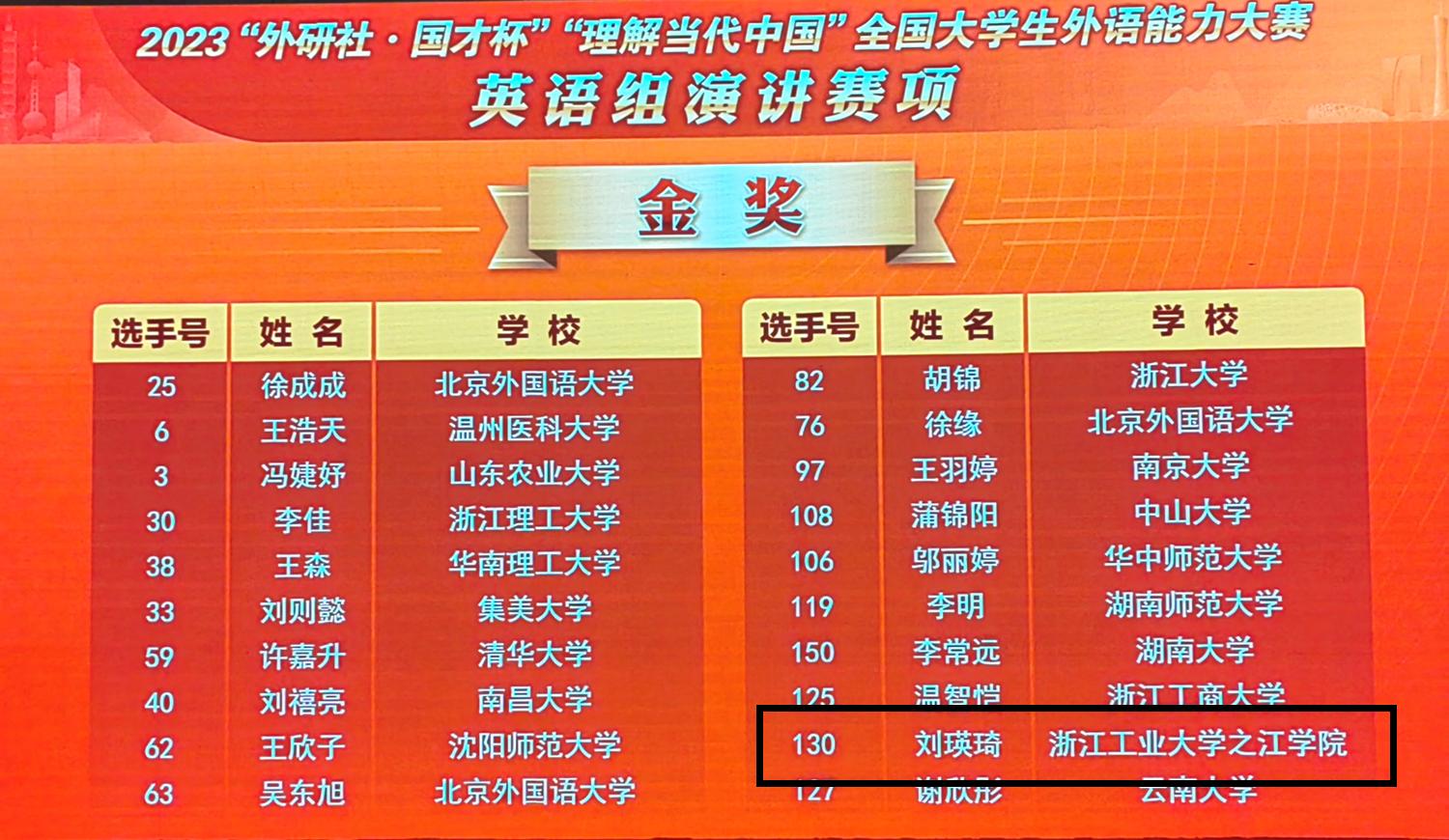 12月5日,2023“外研社·国才杯”“理解当代中国”外语能力大赛演讲赛道全国总决赛在北京圆满落下帷幕。来自全国各省共计150名顶尖选手在演讲最高舞台同台竞技。经过激烈角逐,我院外国语学院英语2002班刘瑛琦(指导老师:童朝华)荣获国一金奖,取得了历史性突破,我院成为全国唯一获得该赛道国赛金奖的独立院校!