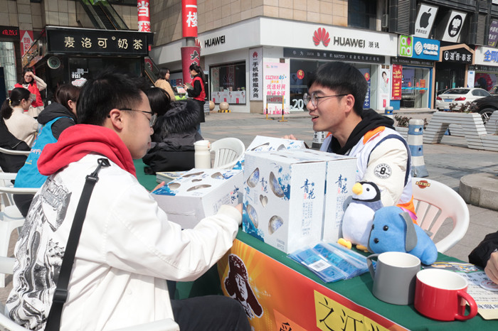 信息工程学院志愿者在蓝天市心广场进行爱心义卖