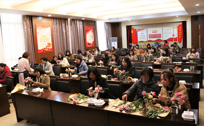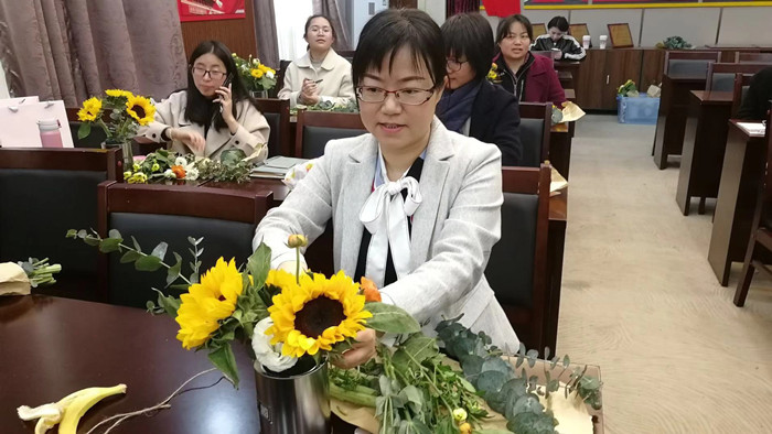 38日下午,学院机关工会为女职工们举办了一场温馨有趣的“女神课堂——生活花艺课”,40余位女教职工在一起共度了美好的时光。大家在老师的授课中不仅了解了中华花艺的历史渊源,还边看边学,修枝剪叶,完成了一盆盆色彩缤纷、形态多姿的艺术品,每个人的脸上都绽开了美丽的笑容。