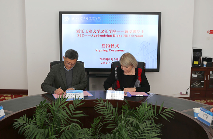 1月24日上午,我院举行聘任仪式,隆重欢迎国家级专家、南非国家科学院院士戴安娜•希尔德布兰特(Prof. Diane Hildebrandt)落户之江学院。院长李澎林代表学院与戴安娜院士签订了聘任合同。会议由组织人事部部长主持,学校办公室、地方研究院负责人参加了会议。