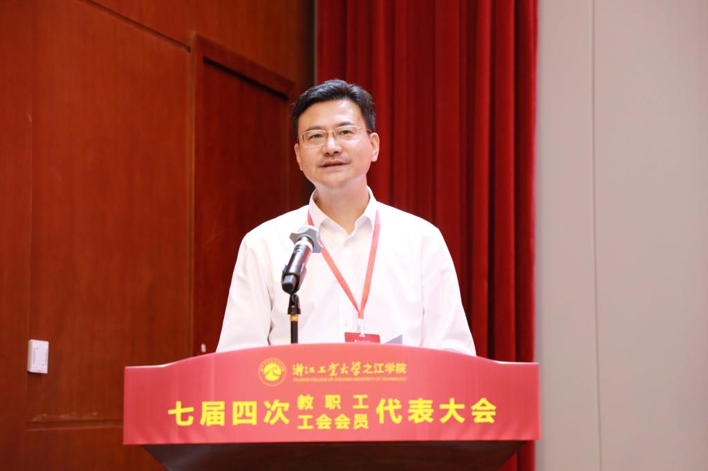 党委书记何作井在闭幕式上致辞。他指出,“双代会”是学院民主政治生活中的一件大事,是学院听取广大教职工意见建议,促进科学决策、民主决策、依法决策的重要途径。他强调,2024年是实施“十四五”规划、建设教育强国的关键之年,也是学院本科办学25周年,学院各级教代会和分工会组织围绕中心、服务大局,带领广大教职员工同心同德、同向同力,共同推动学院各项工作取得了新进展。为圆满完成全年目标任务,他提出三点要求:一是大力弘扬质量文化,深入推进区域特色鲜明的一流的应用型大学。随着高等教育需求由“数量普及”向“质量赶超”的历史性转变,社会对高水平高等教育的强烈需求日益增长。“质量”是生存之本和发展之道,要在质量文化建设上不断深化,形成以质量为先的价值导向,建立健全工作质量标准和流程,专心致“质”,以“质”增效,全方位推进学院事业高质量发展。二是积极推进民主管理,加快推进内部治理体系现代化。要进一步加强沟通机制和协商机制建设,充分凸显教师主体地位,发挥教师在学院管理中的积极作用,营造积极向上、和谐融洽工作氛围,提升学院管理水平和教育质量。三是激发团队凝聚力,构建更加紧密的学院发展命运共同体。广大教职工要进一步践行“尚德致知、敢为人先”的院训,自觉地把个人追求与学院发展结合起来,努力成为各项政策措施的积极响应者、有力推动者和坚定执行者,与学院发展“同呼吸、共命运”。