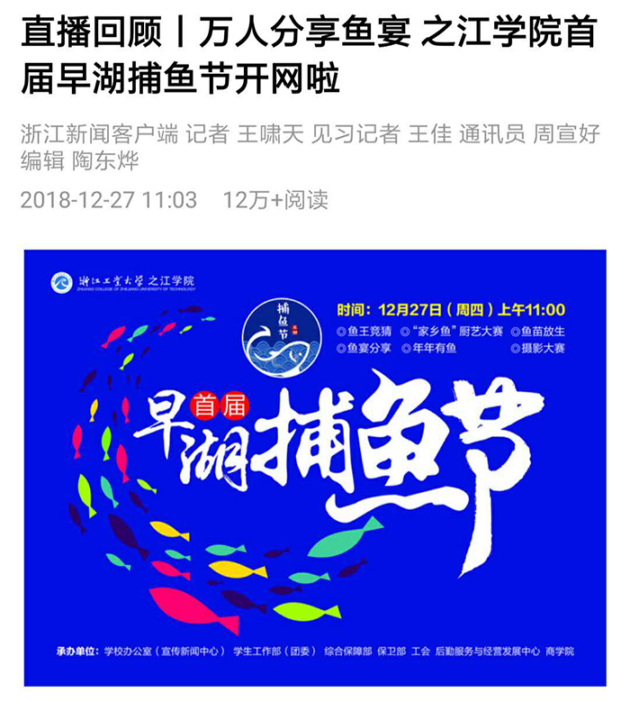 杭州新闻2018-12-27杭州这所高校举办了首届“早湖捕鱼节”,万人分享鱼宴