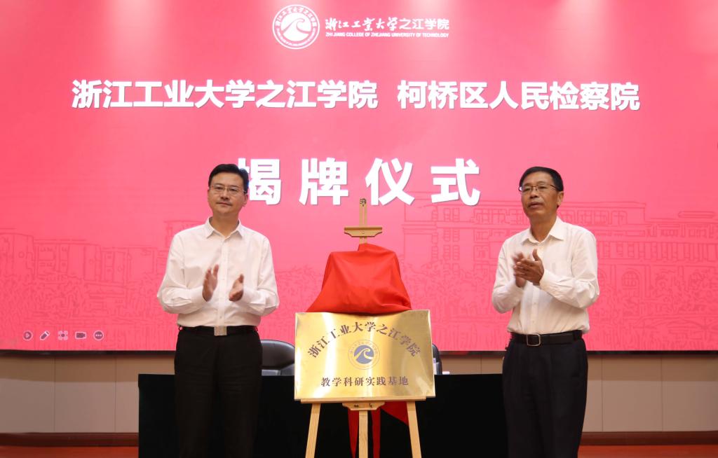签约仪式上,何作井、钱昌夫共同签署了合作框架协议,并为教学科研、“检小青”党团教育实践基地授牌。双方将以此次合作为契机,充分发挥各自资源优势、人才优势,搭建互利双赢的办案、教学、实践、研究平台,在学生实习实践、法学研究与课题合作、继续教育与培训等方面开展深度合作,通过全方位、深层次、多样性的合作共建,助力柯桥区院检察工作提质增效,推动之江学院法学教学科研工作高质量发展。