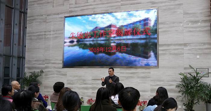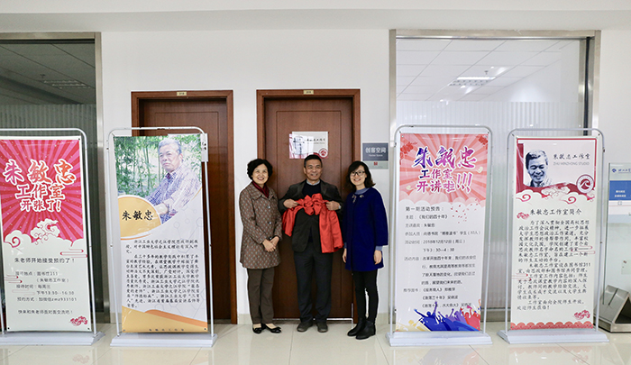12月6日中午,朱敏忠工作室成立暨揭牌仪式在图书馆二楼大厅举行。我院党委书记郑雅萍出席仪式并讲话,学院相关职能部门和人文学院班子成员,思政部教师代表、学生代表参加了成立仪式。