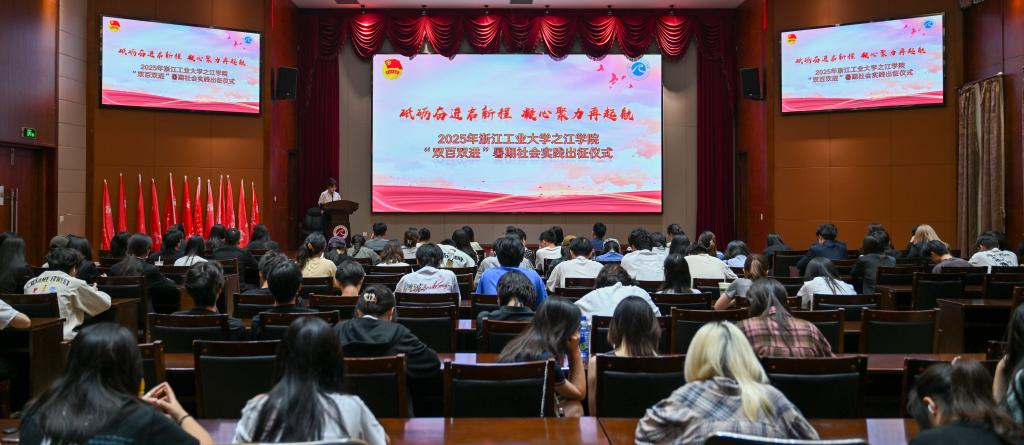 6月24日,学院2025年“双百双进”暑期社会实践出征仪式在行健楼117举行。学院党委副书记刘琦出席仪式,柯桥公安分局常驻之江学院警务站警官毛庆荣,学院团委、组织与宣传部等相关职能部门负责人,各二级学院学生工作负责人、分团委书记及实践队员代表等120余人参加仪式。
