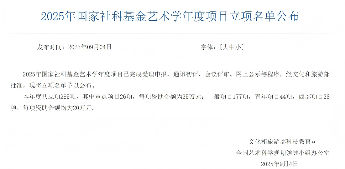 国家社科基金艺术学项目是我国艺术学研究领域层次最高、资助力度最大、权威性最强的国家级科研项目,其立项与否是衡量高校艺术学科研实力和学术水平的重要标志。2025年度全国立项共285项。