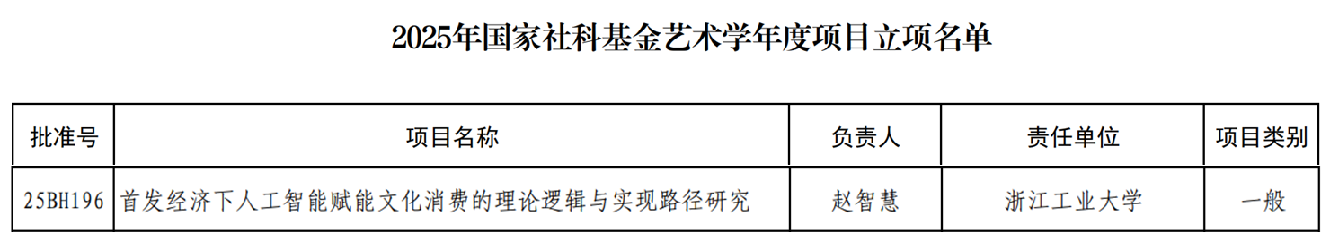 近日,全国艺术科学规划领导小组办公室正式公布2025年度国家社科基金艺术学项目立项名单,我院赵智慧副教授主持申报的《首发经济下人工智能赋能文化消费的理论逻辑与实现路径研究》成功获批立项。这是学院自2022年以来,再度斩获国家社科基金项目。