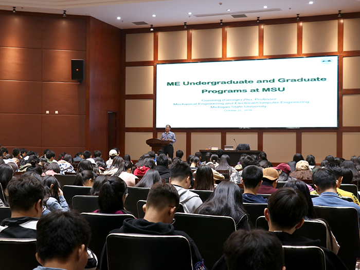 讲座中,朱国明首先从中美的本科及研究生教育差异入手,介绍了美国大学教育的模式,重点对美国密歇根州立大学进行了简要概述。随后,他深入讲解了美国大学的办学理念、环境特点、教学模式,并运用大量案例详细阐述了密歇根州立大学工程领域的本科和研究生教育的教学目标、课程设置、专业特色等。他认为,本科教学给同学们提供了一个平台,可以学习更加多元化的知识,而工程领域的学生毕业后能够成为多个领域的专家,而非仅仅局限于某一个领域。讲座最后,他鼓励同学们在大学期间培养解决问题的能力,提升自我管理水平,以更多的思路和方法来定位自己未来的人生道路。