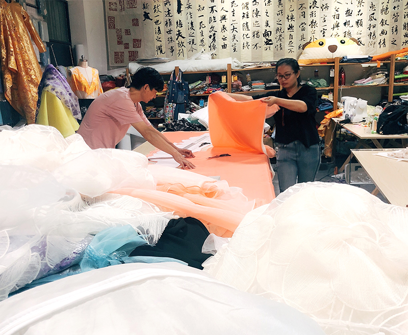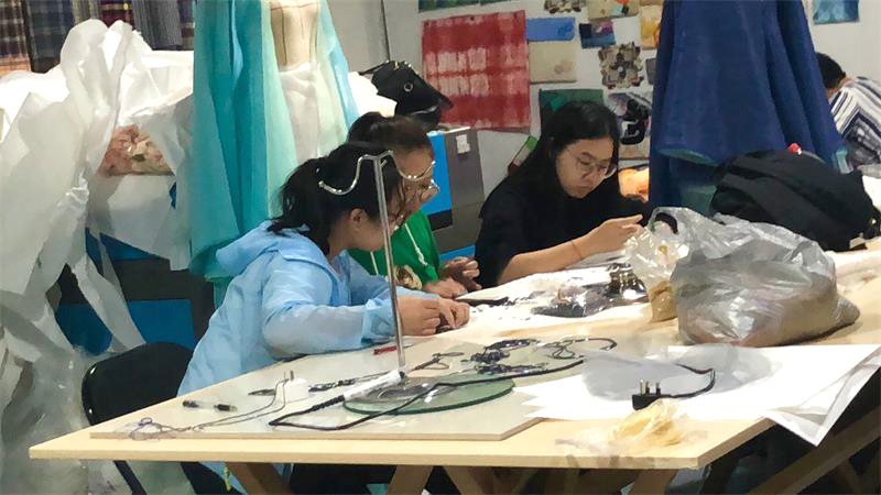 礼服制作过程中,裘海索教授带领学生一起创作,指导学生实践
