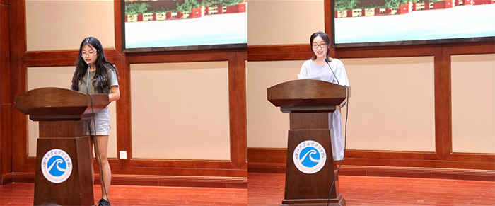 仪式上,信息学院通信1403班潘琼怡代表2018届毕业班校友联络员在仪式上发言,她表达了对母校的感谢与不舍,并表示一定会肩负起母校寄予的重托。工程0902班曹宇欣代表往届校友联络员发言,她简要介绍了近几年校友联络员工作开展情况,希望学弟学妹们能尽快融入各地校友会,利用校友会这个联络校友感情、互帮互助、回馈母校、共谋发展的平台,充分发挥校友联络员的纽带作用。她说,校友兴则母校兴,校友强则母校强,她倡议校友联络员持续关注和支持母校的发展,积极推广“百元基金”等活动,力所能及地为母校教育事业发展添砖加瓦,并祝福学弟学妹前程似锦,祝愿母校越办越辉煌。