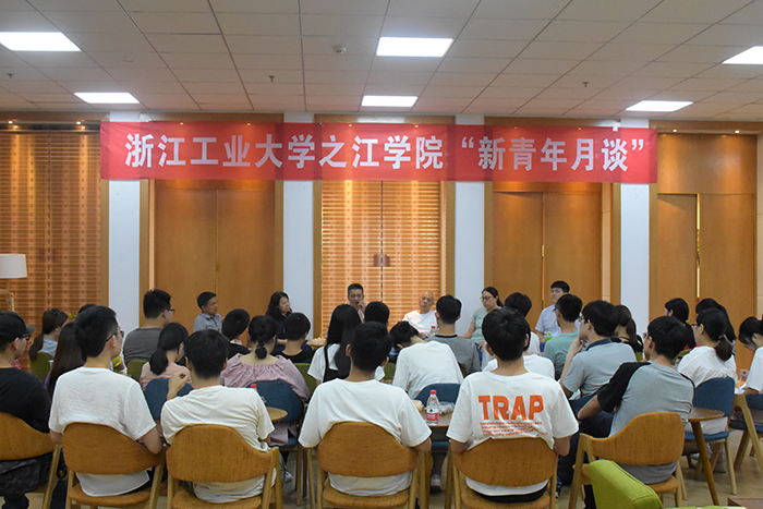 在建党97周年到来之际,学院学生思想政治工作“新青年月谈”第二期活动于6月25日晚在绍兴校园“之江云”师生服务大厅举行,学院大学生学习贯彻习近平新时代中国特色社会主义思想研习会指导老师、思政部资深教师朱敏忠作题为“漫谈新时代中国特色社会主义”的专题分享。学院团委负责人、思政部教师代表、学院大学生学习习近平新时代中国特色社会主义思想研习会成员代表、团员青年代表近50人参加了活动。