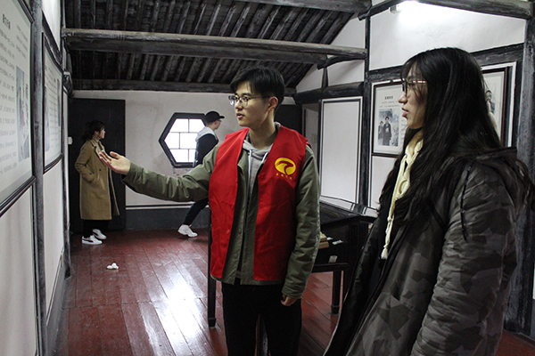 中旅学院志愿者在安昌古镇引导游客文明参观