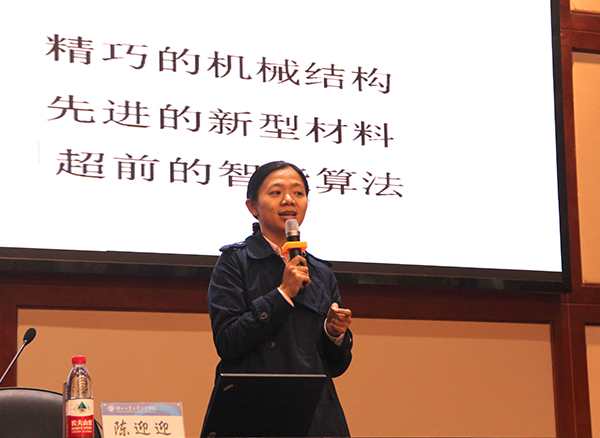 讲座中,陈迎迎以“什么是机器人?”、“你脑海中的机器人长什么样?”等问题引入,通过大量的具体实例和案例分析,介绍了机器人的定义、机器人技术的基本内涵和难点。随后,她详细分析了机器人的基本结构、驱动与运转、感知与控制、深度学习策略等专业技术,用科学的视角为现场师生展示了新型高端技术。讲座最后,她以机器人“没有情感”、“人造”、“任务人设”等设定为例,阐述了机器人发展的三大原则,揭示了机器人等新型高科技发展的方向。