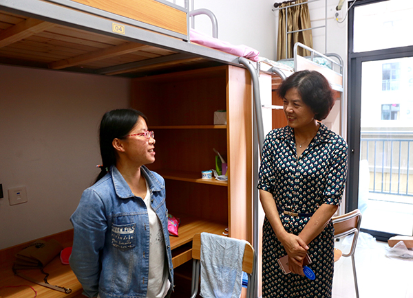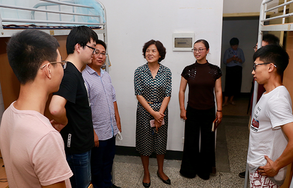 在走访新生寝室期间,郑雅萍还慰问了仍在值班等候新生报到的公寓工作人员和学生志愿者们。