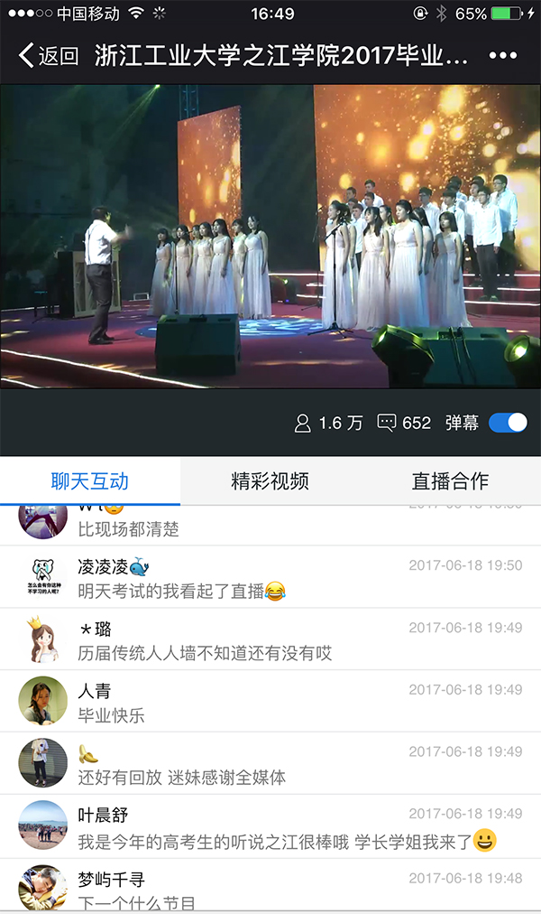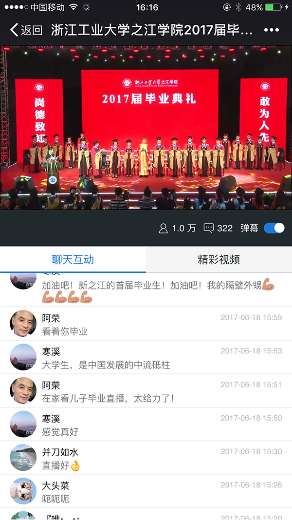 因为不在校园,看不到毕业的场景,听不到毕业的歌会?不,这个可以有!6月18日,之江学院官方微信平台对学院2017届毕业典礼和毕业生歌会进行全程高清现场直播。其中,毕业典礼观看人数超过1.1万,毕业生歌会观看人数超过1.6万。“我在动车上看直播”,“我在贵州旧城看直播”,“我在群贤顶楼看直播”“我在馋猫烤鱼看直播”……不管你身在何处,都能随时随地进行观看。