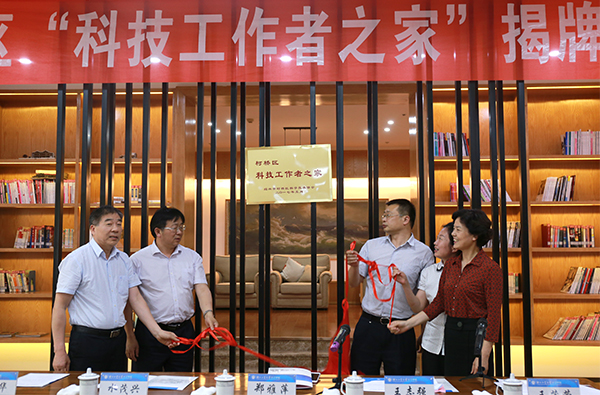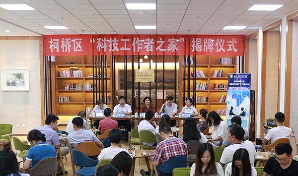 郑雅萍、王志强、水茂兴、王茂荣、孙建华共同为柯桥区“科技工作者之家”揭牌。