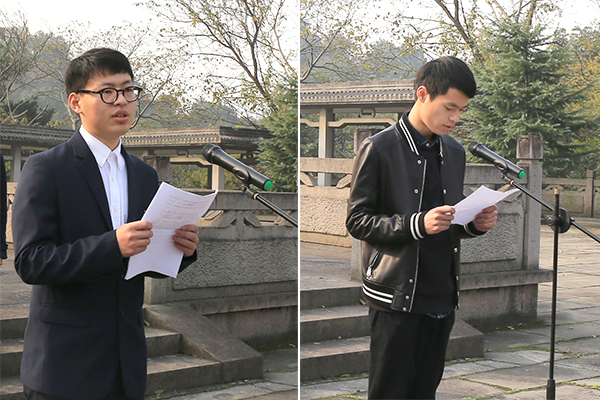 人文学院刘叶晟同学、理学院杜荧欣同学分别代表预备党员和入党积极分子发言。活动还向烈士纪念碑敬献了写有“革命烈士永垂不朽,之江学院全体师生敬献”挽联的花圈,现场师生郑重地向纪念碑三鞠躬,表达对共和国革命烈士的崇高敬意。最后,在国际歌的音乐声中,预备党员们排着整齐的队伍绕陵园一周,瞻仰烈士墓碑,并献上了自己亲手制作的白花。
