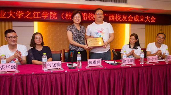 会上,郑雅萍为广西校友会授牌,并对广西校友会的成立表示祝贺。讲话中,她简要回顾了学院的发展历史,介绍了学院教学、科研、人才培养及社会服务等方面取得的成绩,并向校友们重点介绍了学院迁建绍兴的缘由,对广大校友关心的学院近期的发展以及近几年全国独立学院排名、学院各地校友会建设、学院教育基金会发展等情况做了详尽的说明。同时,她对参与广西校友会筹备工作的校友们表示感谢,希望广西校友会在今后的发展中,聚合力、巧借力,办出特色。她还诚邀广大校友能常回母校看看,参与今年十月的校友值年返校的活动。