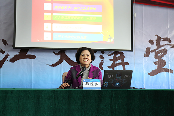 讲座中,郑雅萍首先对党的十八届五中全会精神进行了解析,她通过大量的图表、数据和案例,生动地介绍了会议的主要议程、背景、要点和关键词。接着,她结合李强省长给浙江工业大学师生作形势政策报告会的精神,详细解读了省委十三届八次全会的主要议程和会议要点。同时,她以“十二五”期间浙江高等教育取得的成绩为切入点,揭示了“十三五”期间浙江高等教育面临的形势与任务,剖析了“十三五”期间浙江高等教育的具体任务和指标。她还从柯桥区“十二五”期间取得的成绩和“十三五”期间面临的形势出发,阐述了柯桥区“十三五”规划的发展定位和具体目标。最后,她深入浅出地对浙江工业大学和我院的“十三五”发展规划进行了分析,并结合教育部关于高校转型发展的意见为在场师生系统介绍了我院应用型高校建设的发展目标和发展思路。