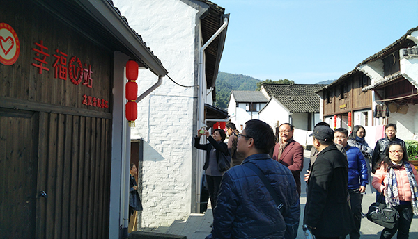 在漓渚镇,学院教工支部书记一行走进绍兴市唯一的“浙江最美村庄” 棠棣村,考察了棠棣村的美丽乡村和农村精神文明建设情况。实地参观了该村的党建特色、文化长廊、便民服务中心、道德讲堂、苗木种植示范基地、截污纳管工程、四化三边工程等特色文化工程建设,并就该村未来乡村旅游发展方向、民宿建设方向等进行交流、探讨。漓渚镇党委书记钱清华当场表示把棠棣村作为学院旅游专业的实习实训基地,希望早日成型。