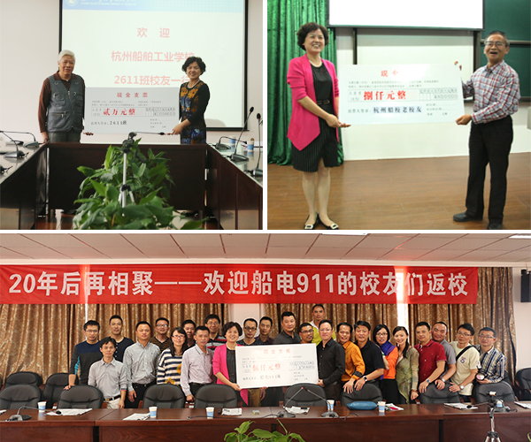 2611班(左上)、64-69届校友代表(右上)、船电911班(下)向学院教育基金会捐款