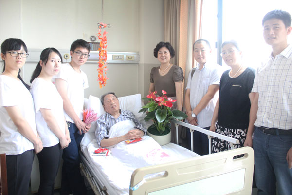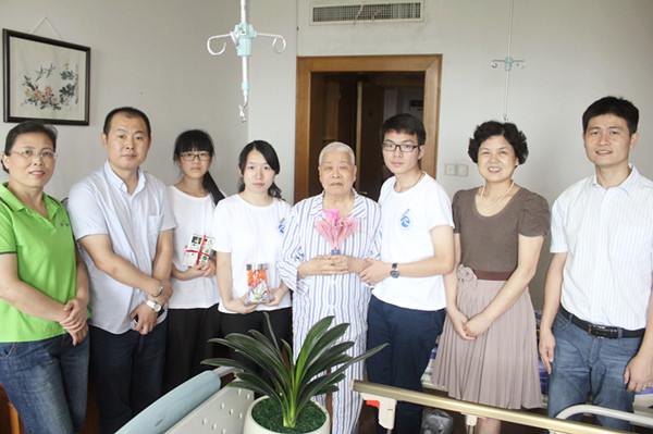 7月21日,实践队来到了杭州望江山疗养院,88岁高龄的刘玉俭老人正躺在病床上。当队员们走进布置整洁的房间时,老人不顾疲惫的身体,硬是搀扶着起身迎接我们。虽然年事已高,但是刘老的精神状态依然良好。郑雅萍代表学院向刘老送上了慰问金和鲜花,队员们则为老人献上了手工折叠的百合花及88只手工千纸鹤,祝愿老人健康长寿。同时,他们还专门制作了一套印有学院校园美景的明信片。当看到熟悉的校园建筑,老人显得十分开心和激动,嘴里不停地说着“谢谢”。
