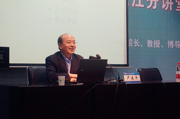 讲座中,卢建平解析了十八届四中全会《中共中央关于全面推进依法治国若干重大问题的决定》中法治建设的内容和要求,指出了中国当前法治建设在立法、执法、司法、守法与用法中存在的问题,阐述了建设中国特色社会主义法治体系、建设社会主义法治国家的总目标、原则、方法和具体目标。他还结合我国法治建设的实际,从依宪治国、科学立法、依法行政、公正司法、强化监督、全民守法等六个方面剖析了建设中国特色社会主义法治体系、建设社会主义法治国家进程中的重点和难点。他认为,全面推进依法治国的重中之重是依法保障公民权利的同时坚持社会主义市场经济。最后,他就全面推进依法治国提出了三点建议:一是法治能真正落到实处,为社会的长治久安进行制度安排;二是党在依法治国、依法行政中发挥领导与先锋模范作用;三是通过法治建设,让人民得到真正的实惠。整场讲座,他引经据典、妙语连珠,赢得了在场观众的热烈掌声。