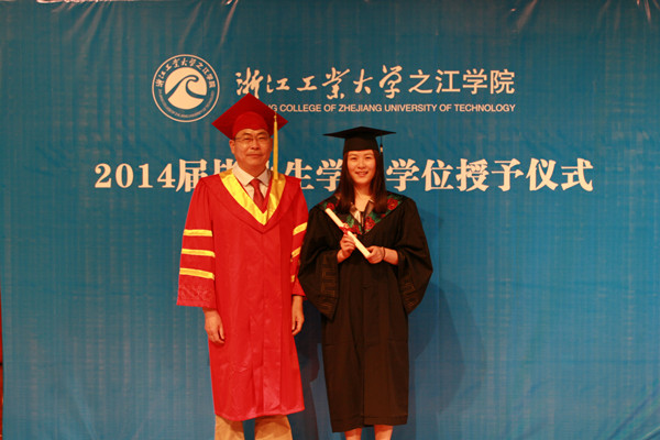 在随后举行的2014届毕业生学士学位授予仪式上,计建炳为获得学士学位的毕业生们颁发学位证书、行“正冠拨穗”礼。