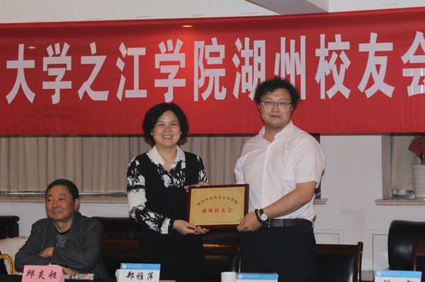 郑雅萍为湖州校友会授牌并致辞。她向校友们介绍了近年来学院的变化和发展,特别是在绍兴校园建设、人才培养、学科建设等方面取得的进步,并热情邀请湖州校友参加5月25日学院本科办学15周年暨移师绍兴庆祝活动。她对新成立的湖州校友会提出了几点希望:一是希望第一届湖州校友会理事会成员能够充分利用校友会平台,加强与母校的联系,架起校友、社会和母校之间的沟通桥梁,畅通信息交流的渠道;二是尽快建立章程,充实校友信息,听取校友意见,分片整合资源;三是促进母校与校友间的产学研合作,协同创新,继续关心学院的发展,支持学院的“二次创业”。