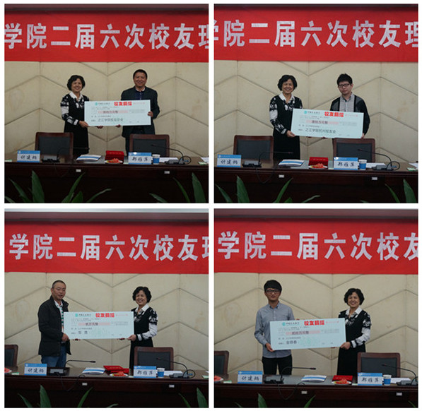 董国民总结了学院二届五次校友理事会近一年来开展的工作情况,对校友会下一阶段的工作作了具体布置。会上,学院校友总会(80万)、杭州校友分会(10万),以及绿朋国际集团有限公司董事长金晓春(20万)、重庆重齿运输公司总经理邹晟(2万)分别代表校友组织和个人,向之江学院校友基金捐赠资金共计112万元。来自各地校友会的代表分别介绍了各地校友会的建设情况,并分享了建设经验。