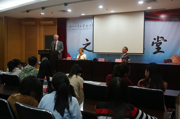 10月22日,美国宾夕法尼亚州前议员Franklin Leo Kury携夫人Elizabeth Kury作客之江学院。学院院长计建炳、外国语学院领导班子成员热情地接待Franklin Leo Kury夫妇。下午3点20分,Franklin Leo Kury及夫人在杭州校园为全院师生作讲座。