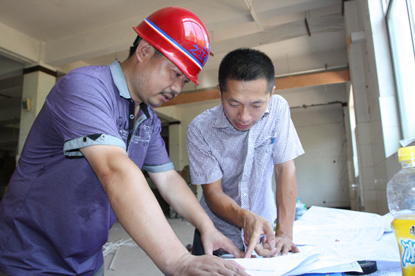 周文华和陈佳弟两位老师总是往来于各个施工现场,由于施工队伍众多,仁者见仁,智者见智,偶尔出现较为混乱的场面也是在所难免的。经过一段时间的协商,意见达成统一以后,大家又开始紧张地忙碌了。此外,在教学楼改造过程中,有时会有意外事件发生。如敲墙这个事,看看不是大事,但一锤子下去有时会造成与施工图纸不符或者图纸与现实有差距等大问题。此时,周文华老师就会召集小组人员,马上做出技术指导,以及施工方案的调整。陈佳弟老师:“每天,他们都要跟着施工队伍一起上下班,通常是顶着烈日,整天地勘察施工现场,目的就是为了指挥施工的顺利进行以及协调各类施工中的突发事件。”
