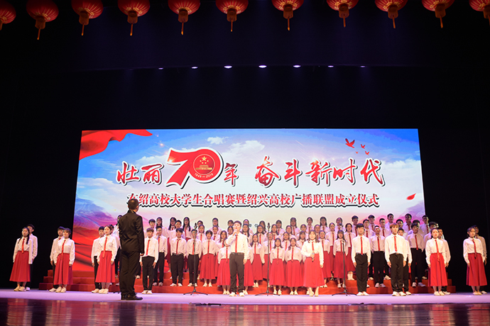 仪式上,包括我院在内的11所在绍高校的广播台和绍兴市新闻传媒中心广播事业部三个频率联合成立了绍兴高校广播联盟。随后,11所在绍高校师生为观众送上了《我爱你中国》《我和我的祖国》《保卫黄河》等多首经典爱国歌曲,并穿插了舞蹈、朗诵、情景剧等表演,演出亮点纷呈,赢得阵阵掌声。我院大学生合唱团精心准备了混声合唱《国家》,并通过诗歌朗诵、手语表演等形式,表达了青年大学生炙热的爱国主义情怀,展现了我院学子良好的艺术素养和精神风貌。